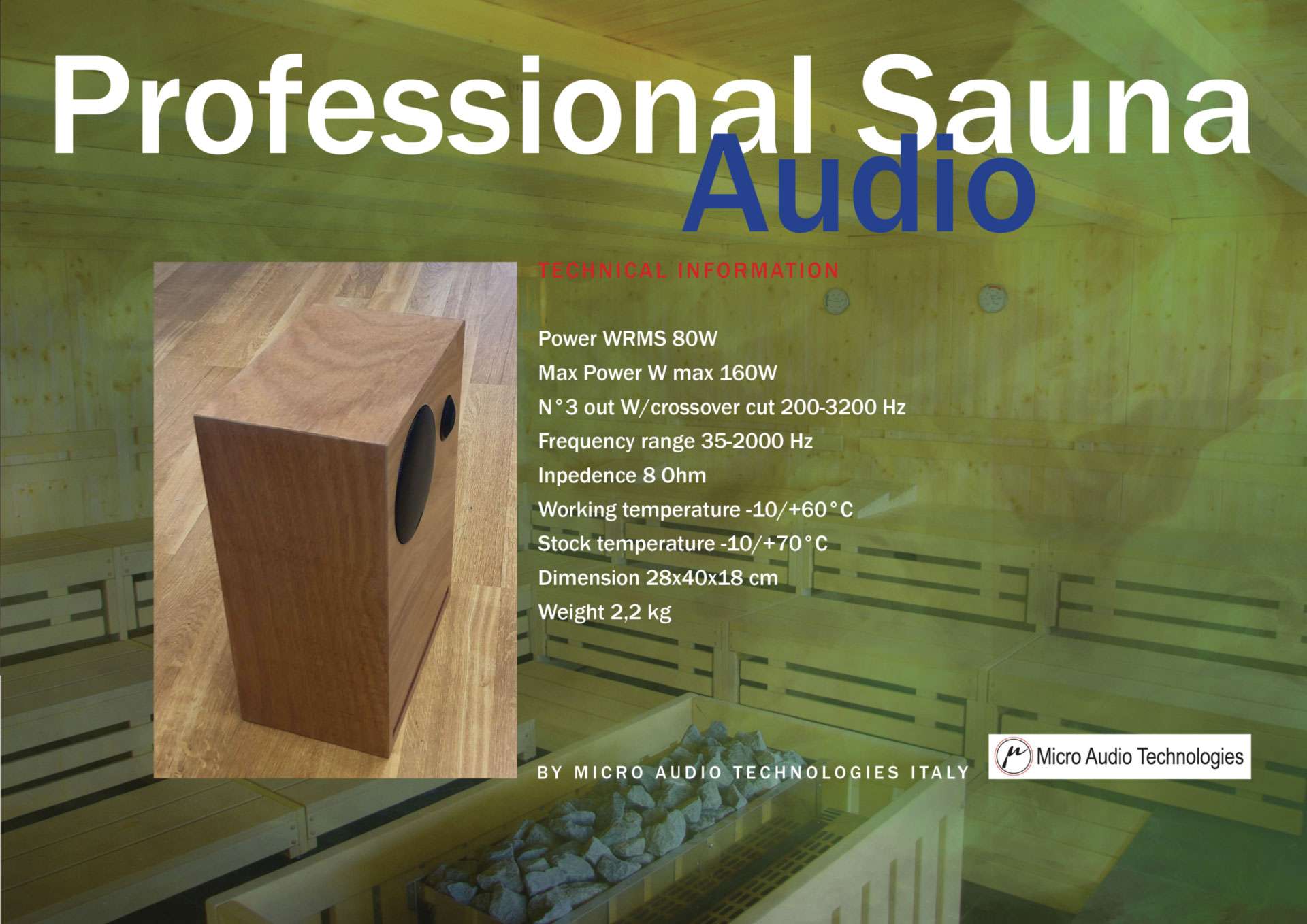 The best solution for augfuss sauna events. It is a directional full range audio system specifically designed for high temperature and wet environments. Through its 3 speakers including a built-in subwoofer reproduces high quality sound results in all frequencies range and even in low frequencies. Built with special material is completely waterproof and water resistant. A specific draining output is provided to drain residual water that could remain in the speaker after the use or after room cleaning.